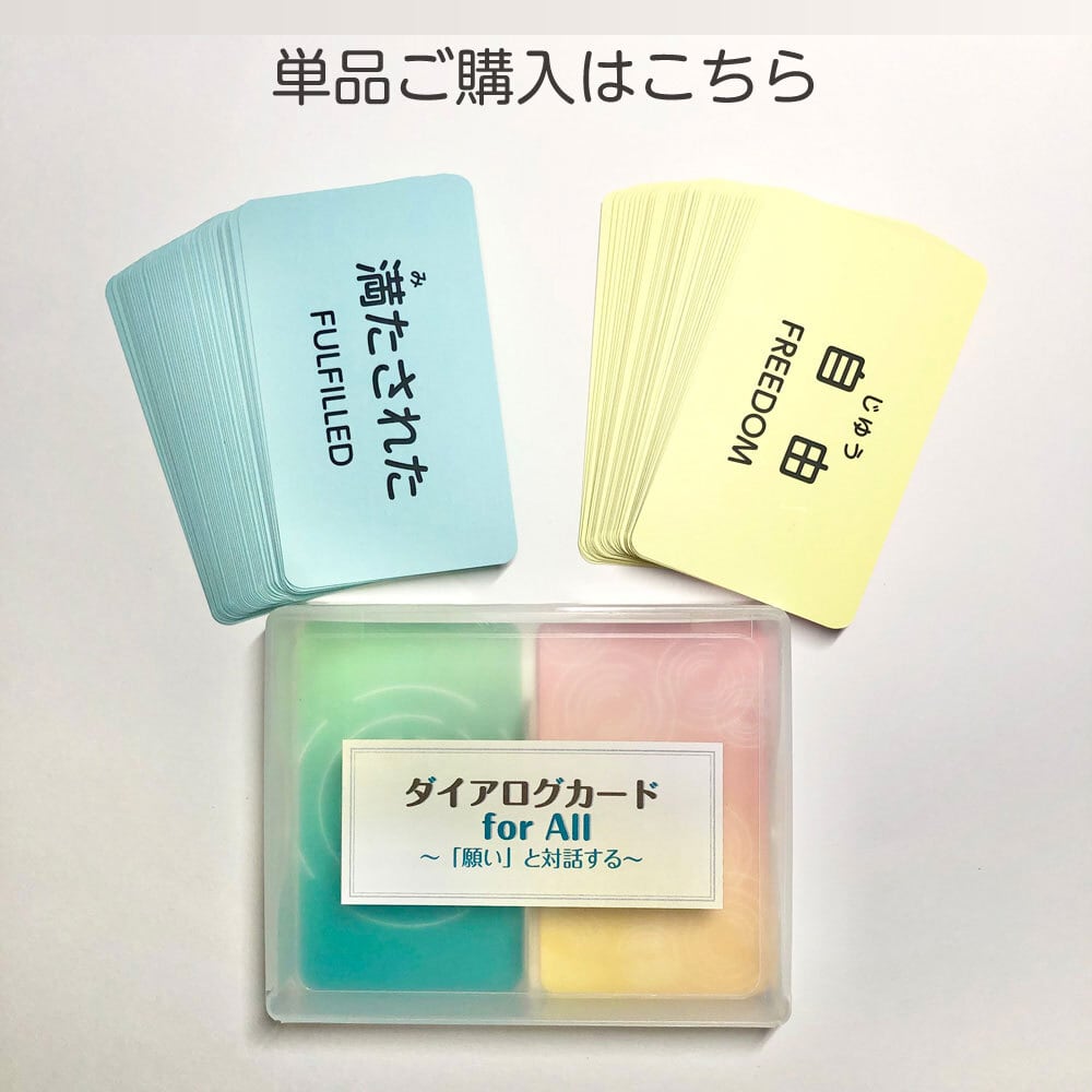 「ダイアログカード for All」は、自己や他者との対話をサポートする全世代向けダイアログ(対話)カードです。「感情の奥に大切な願いがある」というNVC (非暴力コミュニケーション)の考えの元、年齢や性別、国籍を超えて誰もが大切にしたい願い(ニーズ)カードと感情カードが入っています。